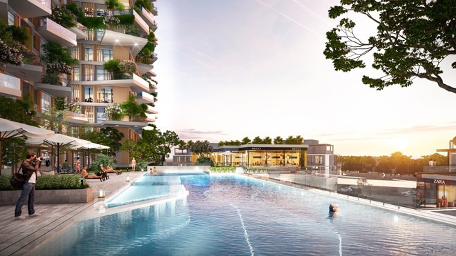 Hệ thống công viên, hồ nước, cây xanh, thác tràn nhiệt đới biến toàn bộ khu phố đi bộ của dự án thành một trung tâm mua sắm giữa lòng một khu rừng nhiệt đới.